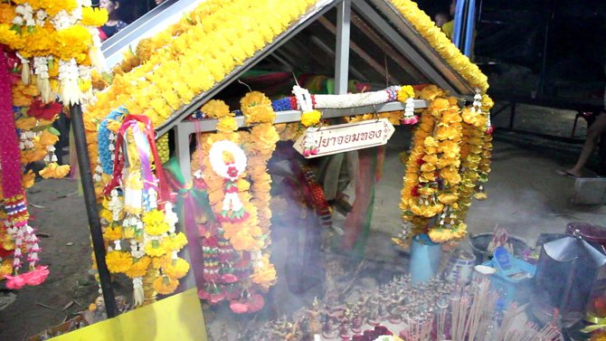 ขณะที่บางคนจะไปกราบไหว้ขอโชคลาภจากศาลจอมปลวกที่ชาวบ้านตั้งชื่อว่า “ศาลปู่ย่าจอมทอง” โดยจะนำผ้าสามสี ดอกไม้ และน้ำแดงมาถวายและขอโชคขอล