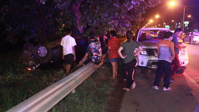 ก่อนรถหมุนหลายตลบไปชนต้นไม้แล้วพลิกคว่ำหงายท้อง